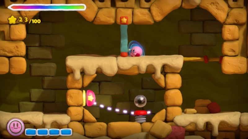In Kirby's Epic Yarn, lanterns are lit by pulling on an associated button with the yarn whip, and instead of illuminating the entire room, lanterns only light up the immediate surrounding area, and slowly grow dim instead of going out suddenly. Stogues, when rolled up into yarn balls, also provide an alternative means of illumination to lanterns.
