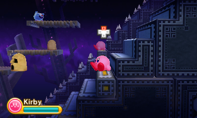 Cranks have a hexagonal handle for Kirby's Robobot Armor to grip onto. To turn one, Kirby (in a suit of Robobot Armor) must approach it and press ↑, the rapidly rotate the Circle Pad. This can have a number of effects, from raising platforms to turning cylindrical chunks of floor. In the case of the latter, rotating it counterclockwise long enough causes the ground to fall out, revealing a collectible.