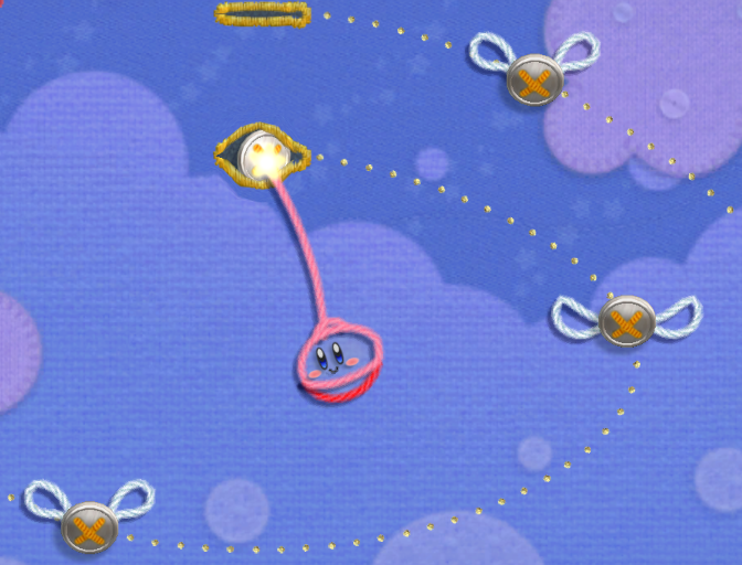 The fourth kind has a silvery, metal appearance, and has two pieces of string crossed at the center. This kind (called a brass button) is for Kirby to transform into the Pendulum. Most of the time, they are static elements, but in Stellar Way and Cloud Palace, they gain wings and can move about, taking Kirby throughout the levels.