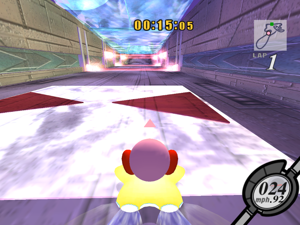 Kirby approaches a blue teleporter.