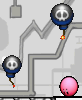 Mines are found in numerous levels. They float in the air or underwater and stick to Kirby when he touches them. Mines will begin beeping once Kirby has come close enough, and will quickly turn red and explode. The explosive can be removed from Kirby if the hero bumps into a wall. Mines appear as a part of the Room Guarder portion of Mad Mechanism.