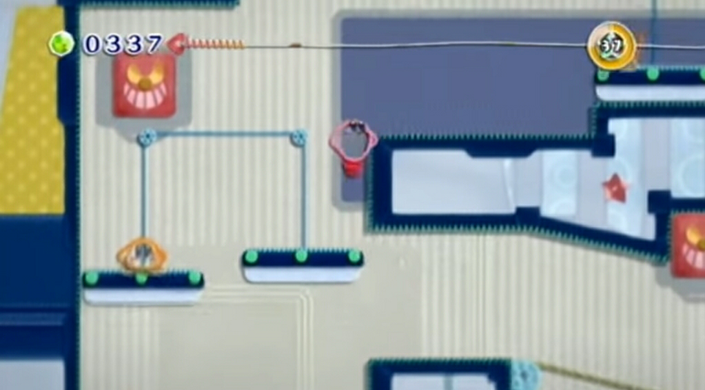 The second kind is made of blue plastic, and has only one discontinuous piece of string visible. When Kirby pulls on a blue button, the object it's attached to will collapse, and stay collapsed, unlike objects with red buttons.
