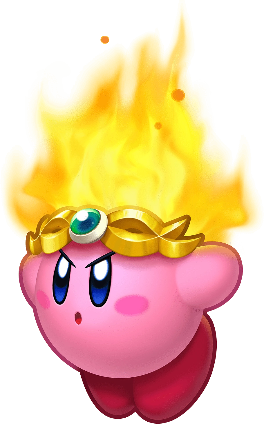 In the transformation sequence, the green gem forms around Kirby's forehead and a yellow headband snaps into it and around Kirby, and his skin turns a vivid reddish pink. Shortly after, flames begin to engulf the area around Kirby before subsiding.