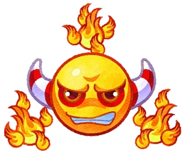 Flare is a yellow sphere with a very scowling glare and white horns with red stripes. It has red facial tattoos surrounding its eyes for decor and to make it look menacing.