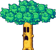 Floaty Woods appears exclusively in Stage 8 of Green Grounds. Unlike the rest of the Whispy Woods family, he has no form of defense. When the Kirbys find him, Floaty appears to be an unassuming tree with a hole in his middle. The player must fling all the Kirbys into the hole, at which point they climb up into the bushel of leaves at his top and try to uproot him. Aghast, the tree awakens and tries to shake them off. If the player rapidly taps the button that appears on the screen, the tree is detached from his roots and topples over. Floaty becomes a raft for the Kirbys, taking them across a short river. He eventually bumps into Wobbly Woods, causing the giant tree to begin teetering.