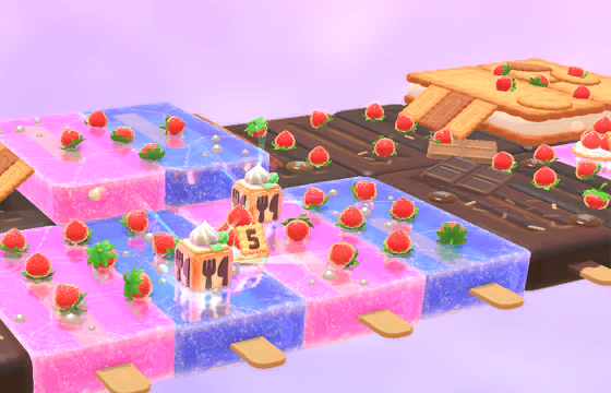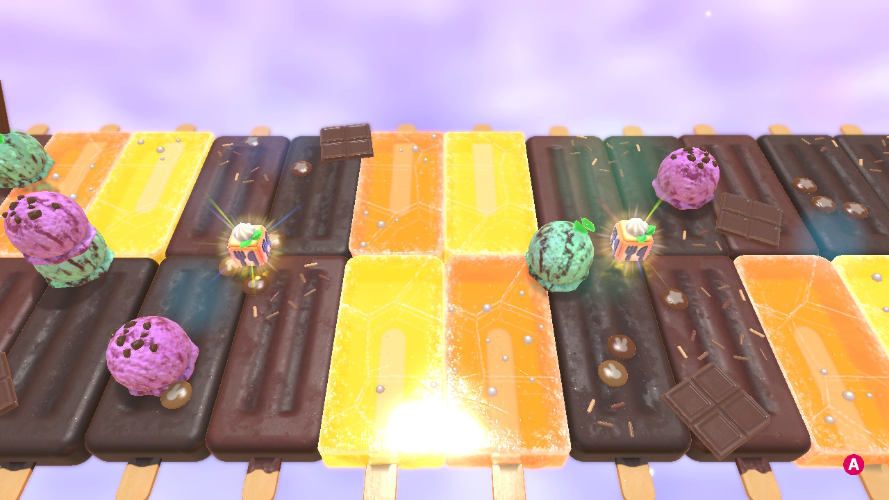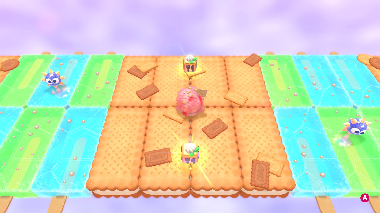 Frozen Treats is a flat, rectangular stage consisting of popsicles, ice cream sandwiches, ice cream scoops, and small rectangular cookies. Popsicles of various colors fill the stage's terrain, ice cream sandwiches commonly serve as elevated platforms, and the cookies serve as ramps to climb up to the elevated platforms or just simple decoration. When rolling on the popsicles, Kirby will slide due to their icy properties, but the ice cream sandwiches let Kirby roll like usual.