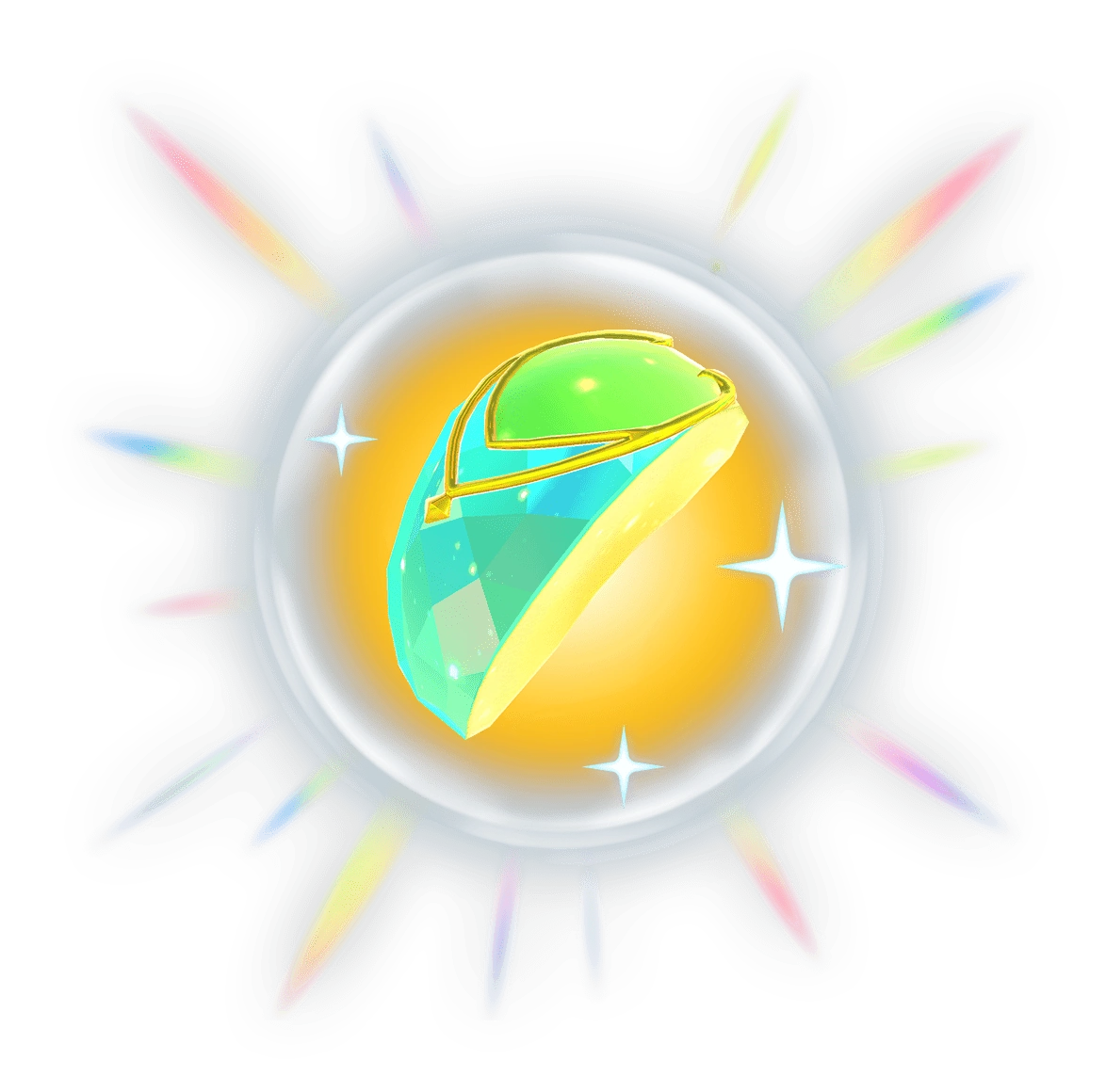 A Fruit Fragment appears to be a giant apple slice with a crystalline appearance to its blue-green skin. Its upper half is adorned with two thin golden filaments, and it emits a bright light that can form a bubble around it when encountered in the field. Multiple Fruit Fragments appear to react with each other on the Ethereal Altar, floating in a slowly rotating formation resembling a slightly disassembled Gem Apple.