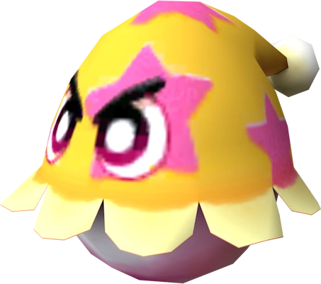 Gemra is an orange hat-like creature with a small white pom-pom on its end and light yellow fringe along its bottom. Gemra has two angry-looking purple eyes that appear plastered on its body, as well as a large, pinkish-purple spherical gem held inside its "hat." Salmon-colored star patterns cover its hat.