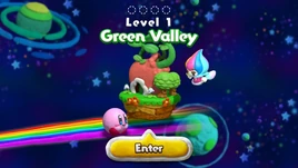 Green Gardens | Springy Hand Land | Dried-up Sea | Coo's Forest | Gourmet Go Go | Butter Building | Waddle Dee Train Tracks | Factory Tour | Haldera Volcano | Castle Lololo | Bubbly Clouds | Dedede Arena | Dyna Blade's Nest | Gigavolt | Fortress of Shadows Jambastion Entrance | The Empyrean | Fountain of Dreams | Stage of Destined Rivals | Stage of the Partners Who Shook the Heavens | Training |