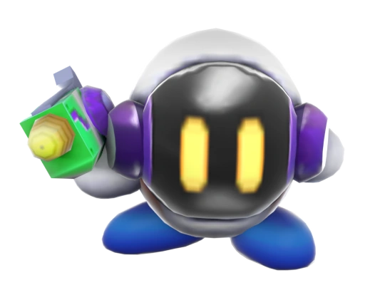 Haltworker first appears in Stage 1 of Access Ark. It walks along the ground slowly, occasionally stopping to fire an electrical projectile from its blaster. Some Haltworkers run or stand in one spot. If Haltworker is positioned on a different plane from Kirby, the enemy fires across the gap to hit him. Its aim is sharper than usual when shooting across planes.