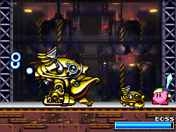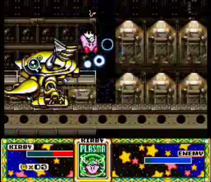 Plasma Kirby fighting Heavy Lobster on Mecheye in the original Kirby Super Star.