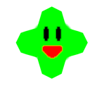 Kacti is a green, plus-shaped cactus with tiny, black eyes and a happy, open mouth.