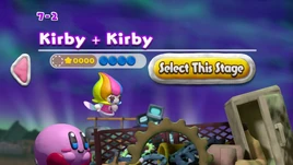 • Kirby + Kirby marks the third time in a game where Kirby is split into more than one copy. The previous two times were in Kirby & The Amazing Mirror and Kirby Mass Attack. However, unlike those previous two occurrences, this splitting of Kirby only happens for one stage and is not treated as an integral part of the game's plot.