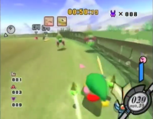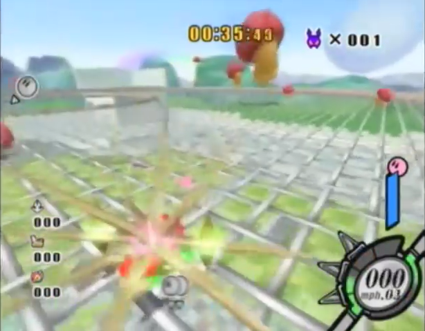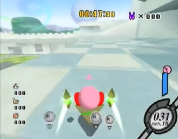 Regular enemies that appear in any of the Air Ride courses in Time Trial or normal racing mode are present in the arena. The objective is to be the player that KOs the most number of them. Should a player or CPU's machine be KO'd by another player or CPU, it will respawn in its last location after a few seconds provided that the Kirby controlling it falls down and lies on the ground for a moment without taking further damage. Otherwise he will fly up into the air again and the respawn will be delayed.