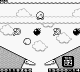 Kirby (with hands and feet) is standing on a cloud platform toward the top of the screen. The spherical Kirby controlled by the player must feed the other Kirby -- he must be tossed and bumped into the food items that float across the screen. When an item is launched over the clouds, the little gourmand will immediately chase after it and swallow it, giving the player points.