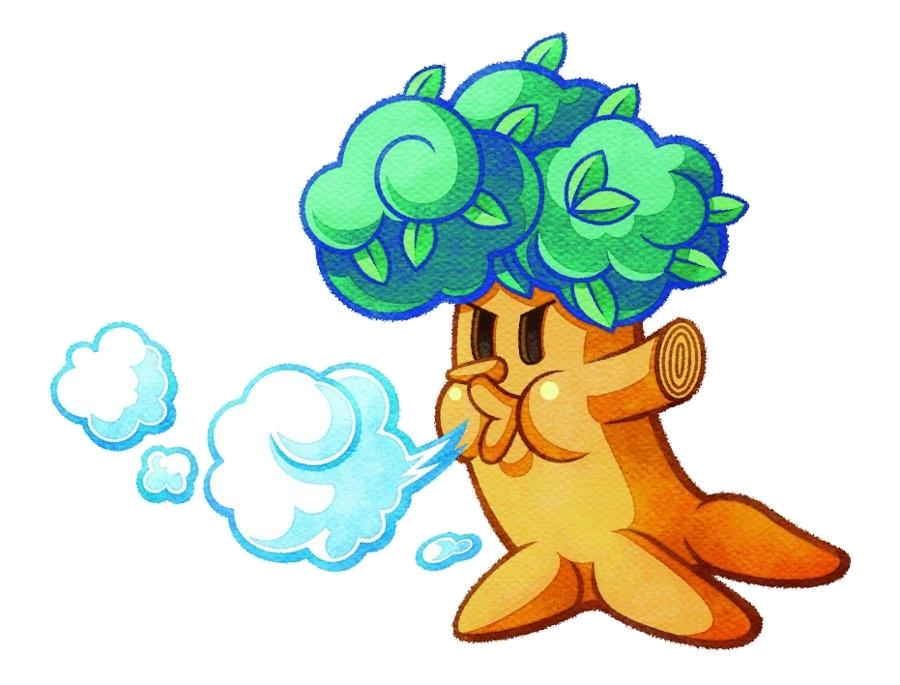 Little Woods appears exclusively in Stage 8 of Green Grounds. It has two variants: a bare variant and a leafy one. The bare one is the most common, often blocking entrances. When the Kirbys approach, it puffs out its cheeks for a brief moment before angrily jutting out its nose, now pointy. This damages the heroes if they touch it. The enemy can also blow three air puffs that do not inflict damage, but instead knock Kirbys back, dizzying them momentarily.