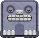 Mega Grindarr is a humongous variant of Grindarr; as such, it is a rectangular stone block attached to a long, silver chain. It has no hands, but instead has feet with three digits on each. It has a pair of vigilant eyes, a nose, a large oblong mouth, and an enormous tongue. The enemy is a metallic gray color.
