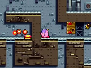 The Machine Planet Mekkai (originally Mecheye) is the mechanical star of the nearby galaxy in Milky Way Wishes. It is the sixth planet, following Cavius and preceding Halfmoon. It is extremely technologically advanced and well built. The entire star looks hand-made. The entire metropolis is large enough to be viewed from outer space. A lot of the planet features numerous hazards, such as the first room having Gordos and electrical hazards, and the second featuring more Gordos and strong winds. The last room features an elevator which leads to all the mid-bosses, similar to Cavius, except only two are necessary to complete Milky Way Wishes.