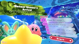 Meteor Shower's Arrival is the forty-first stage in Kirby and the Forgotten Land - Nintendo Switch 2 Edition + Star-Crossed World. It is the eighth stage of Natural Plains and is the Starry version of Point of Arrival. It precedes Lost in Alivel Mall.