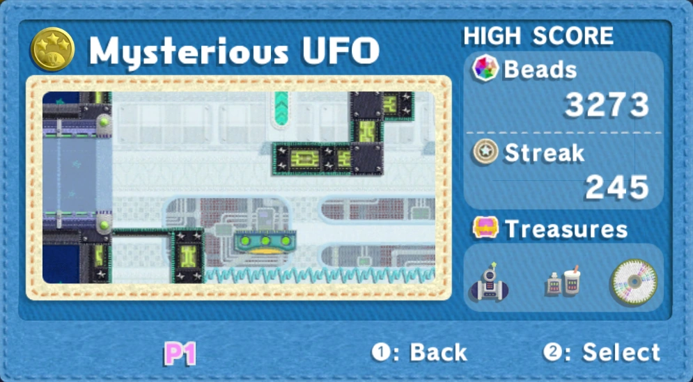 Mysterious UFO is the 39th stage in Kirby's Epic Yarn and Kirby's Extra Epic Yarn and third in Space Land, the seventh world in the games. It comes after Tube Town and precedes Stellar Way. There are no metamortexes in the stage.