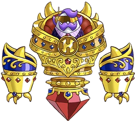 President Haltmann's Executive suit is a gold mech with lilac and red gems encrusted within and indigo designs at the wrists. It also has a pink jewel on the bottom. His 2.0 Executive suit has a stripe of black going around near the top and on the wrists with all of its gems white rather than lilac or red.