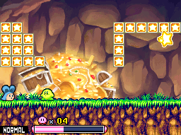 All of the mid-bosses in this game (except for Waddle Doo, Adeleine, and King Dedede) are Room Guarders, however, most of them feature a large version of a regular enemy. Regular-sized enemies, usually of the same type as the large one, can be used as ammo if Kirby does not have a Copy Ability; they respawn after being defeated. Once the large enemy is defeated, the regular enemies can be defeated without respawning, and Kirby is allowed to exit the room. Some of them also drop a Crystal Shard for Kirby to collect. In the fourth stage of Neo Star, there is a Room Guarder that is simply a bunch of Drops falling from the ceiling. Stage 3 of Ripple Star also features Room Guarders that are various regular enemies without a large one in the room. This area serves as a Mid-Boss Tower. This game was the origin of the Room Guarder theme, which is a remix of the mid-boss theme; the theme would play in later games that have Room Guarders, such as Kirby: Nightmare in Dream Land, Kirby: Canvas Curse and Kirby and the Rainbow Curse, as well as against mid-bosses in Kirby: Squeak Squad and Kirby Mass Attack. The theme is also remixed in Kirby Air Ride as an alternate theme for the Light course in Top Ride, Super Smash Bros. Brawl as a part of the Kirby series boss medley, and in Kirby Star Allies as a theme used for various puzzle rooms.