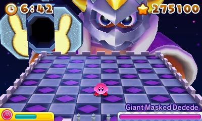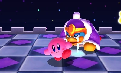 - When Giant Masked Dedede is defeated and the king shrinks down, he lies on the ground crying. This is a reference to the reaction he has at the end of Kirby's Dream Land's Extra Game.