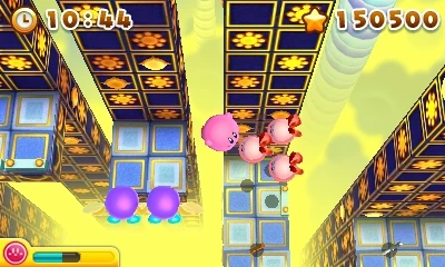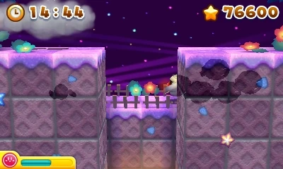 The platform scrolls toward the Z-axis. Pits exist all over, so Kirby must frequently jump from platform to platform. In addition to scaled-up enemies, Waddle Dees, Bronto Burts, Scarfys, Bouncys, Kabus, Soarars, Shotzos, and Babuts inhabit this area. There are three gauntlets as well as a battle against King Dedede's Revenge.