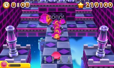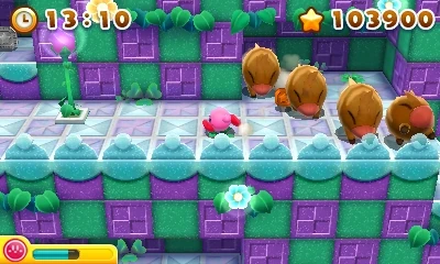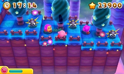 The platform scrolls from left to right, though Kirby must move toward the Z-axis a few times. In addition to scaled-up enemies, Waddle Dees, Spear Waddle Dees, Chips, Grizzos, Scarfys, Bronto Burts, and Gordos inhabit this area. There are three gauntlets and a battle against Lololo & Lalala's Revenge.