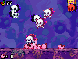 Skully does not physically attack Kirbys, but instead attempts to snatch them. Once it grabs one, it floats around and eventually flees into the sky, instantly KOing the Kirby and stealing him from the player's total. Before it does, the player can flick the heroes into it to save their teammate. Only a few Kirbys are needed to defeat Skully. To make up for this vulnerability, these enemies travel in large swarms.