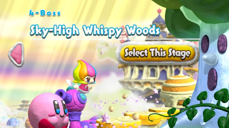 Sky-High Whispy Woods is the sixteenth stage in Kirby and the Rainbow Curse. It's the fourth stage of Blue Sky Palace and the fourth boss stage of the game. It succeeds Kirby Rocket's Big Blastoff and precedes Woodland Battle.