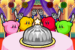Four Kirbys are at a table. The table has a dish with a metallic lid on it. Occasionally, the dish is uncovered to reveal four apples or bombs. By pressing A, Kirby inhales the apples or bombs. Each apple gives the Kirby who inhaled and ate it one point, while any amount of bombs make the Kirby who inhaled it have to sit out for the next round. Whoever gets eight points first wins. If more than one Kirby presses A quickly, the four apples or bombs will be split between the Kirbys.