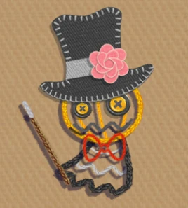 Squashini is a magician-like being. He has an orange jack-o-lantern for a head, complete with glaring yellow eyes and an evil grin. He wears a black and white cape with a red bow tie. Squashini also wears a black top hat with a gray band and a pink rose on it. Squashini appears to have no arms or legs, but he has a wand that he uses to determine and conjure his attacks with the slot reels.