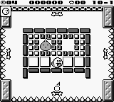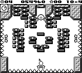 The area has a spiky floor, ceiling, and walls. The player can control four paddles, at the top, bottom, and sides of the screen. The area is filled with ten rectangular white blocks, eight rectangular gray blocks, two square gray blocks, three Power Blocks, 18 Ability Blocks, and a Indestructible Block. A Switch Block is located near the center of the area; it converts most of the blocks into Through Blocks, which grant Kirby a bonus if he clears them all under the time limit. A Bouncy and two Mumbies appear on the block formation; they drop a Changer and Flip items, respectively.