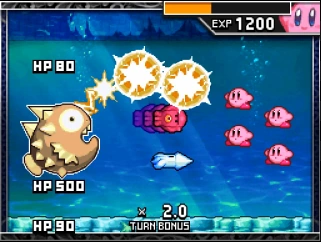 The battle takes place in a deep sea trench, with the screen scrolling horizontally. It swims around accompanied by Squishies and small one-eyed starfish called Tincells. These foes can be blown back at it with Kirby's Water Gun to deal damage, or alternatively they can be inhaled and spat back out at Sweet Stuff should Kirby be teamed with Kine. Sweet Stuff can also fire sparks and arrow-shaped lasers from its lure.