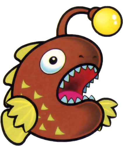 Sweet Stuff is a brown angler fish with greenish yellow fins, a glowing yellow lure, large round eyes, and a gaping jaw full of sharp, jagged teeth. It is shown with a slightly darker palette in its Kirby's Dream Land 2 artwork and in Kirby Mass Attack than in its Kirby's Dream Land 3 sprite.