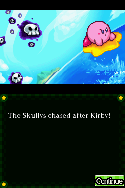 | 18 | Staff Credits | Milky Way Wishes staff credits. Shows Kirby sleeping in his house, as the credits start playing. The skies show previous scenes from the main games. Kirby is then seen on his Warp Star, where he waves at the player before departing. The touch screen then says "and more...". |