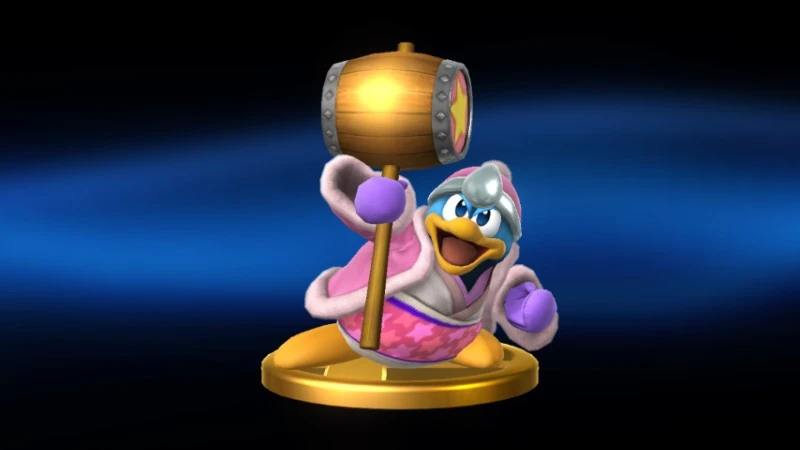 For Dedede's Final Smash, he takes a deep breath, pulling his foes toward him. Once he's gotten them right where he wants them, he'll unleash blows from his giant burning hammer. Topping things off is an explosive from the end of the hammer, sending enemies flying. Could this be worse for his foes? Yes! He's invincible the whole time too! | For Dedede's Final Smash, he inhales fiercely to pull foes towards him. Once he's got them right where he wants them, he thrashes them with a giant burning hammer. Then, to top it off, he fires an explosive from his hammer, sending them blasting off. Could it get any worse? Well... yes - Dedede's invincible the entire time. | |