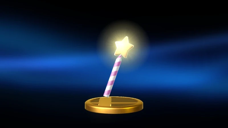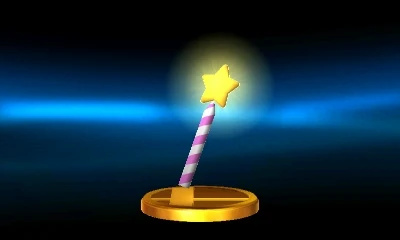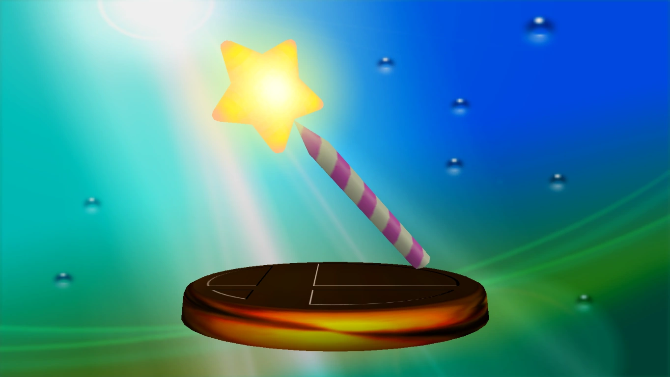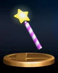 A magic wand. Perform a standard attack with it, and it's a battering weapon. Perform a strong or smash attack, and it fires a barrage of star shots. Throw it at a foe, and that opponent will get sent flying sideways. In the Kirby series, the Star Rod is the power source of the Fountain of Dreams. King Dedede once stole it to imprison the Nightmare Wizard. |