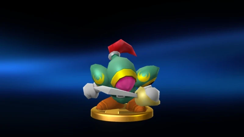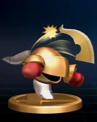 The mysterious head of the Meta-Knights, he wields his sword with dignity. He delivered his sword to Kirby and demanded single combat in a show of knightly honor; his strict adherence to his code of ethics makes him a rarity in Dream Land. Sometimes he throws off his cape in battle. It occasionally transforms into wings. |