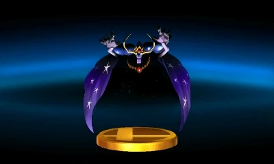 Meta Knight swings his cape to ensnare foes. Darkness falls, enveloping them in an empty void and then a giant sword slash cleaves the blackness. If the cape doesn't capture anyone, this Final Smash will fail. It has more range than you might think, though and you only have to catch one foe to deal damage to everyone! | Meta Knight swings his cape to ensnare foes. Darkness falls, enveloping them in an empty void, and then a giant sword slash cleaves the blackness. If the cape doesn't capture anyone, the Final Smash will fail. It has more range than you might think, though, and as long as it catches at least one foe, everyone will take damage! | |
