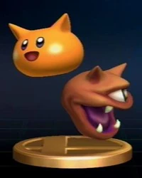 While Kirby swallows enemies in order to copy their powers, Gooey wraps them up in his tongue to steal their abilities. In Kirby's Dream Land 2, he occasionally appeared inside of a bag, but by Kirby's Dream Land 3, he was a full-fledged partner. He could be controlled by setting him up as Player Two. | |