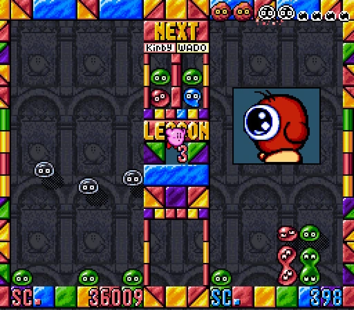 Waddle Doo plays in a similar fashion to Bronto Burt, and his stage still has only four blob colors, with green blobs never being spawned.