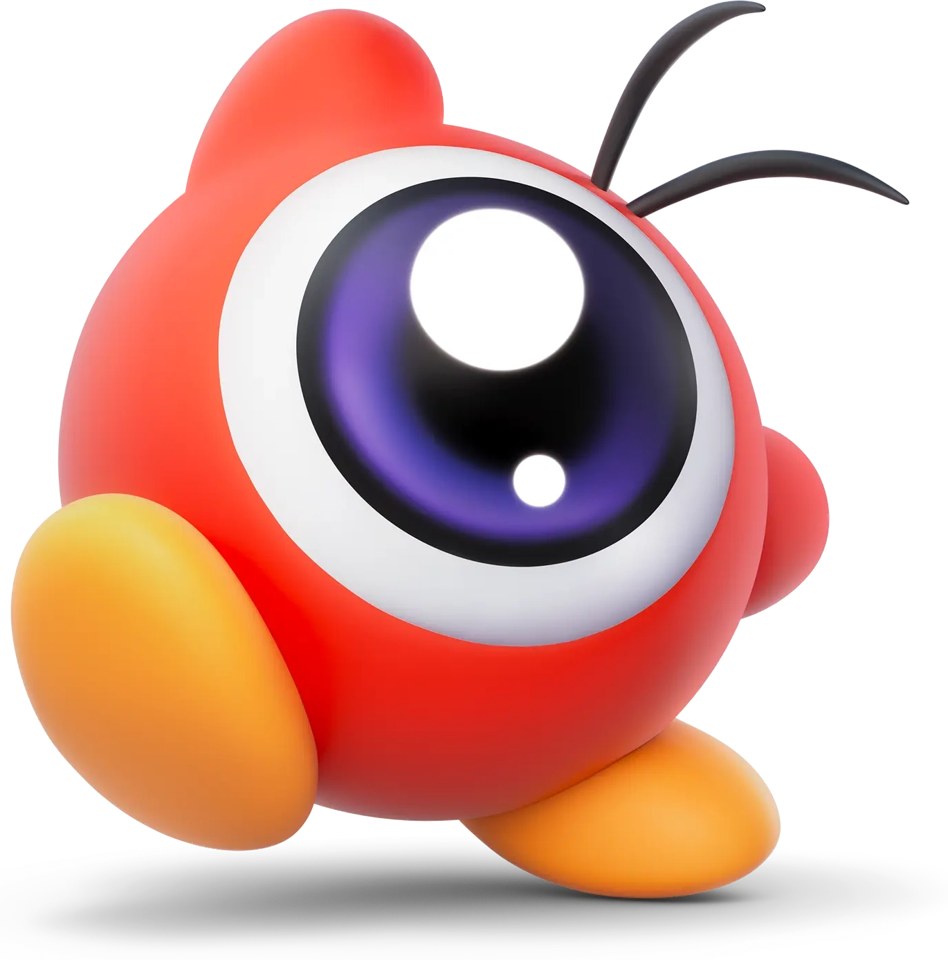 Waddle Doos are similar in appearance to Waddle Dees. They are round, light-coral-colored creatures with stubby arms, light orange feet, and one large eye protruding from the middle of their heads. Above their eye is two strands of hair. Red is their most common color, but they can however appear orange, gray, green, turquoise, etc.. They have no mouths, but in Kirby: Right Back at Ya!, King Dedede's lone Waddle Doo servant can speak, and is the only one who can communicate with the Waddle Dees. As a Helper in Kirby Star Allies, Waddle Doo wears the hat Kirby wears when he gets the Beam Copy Ability.